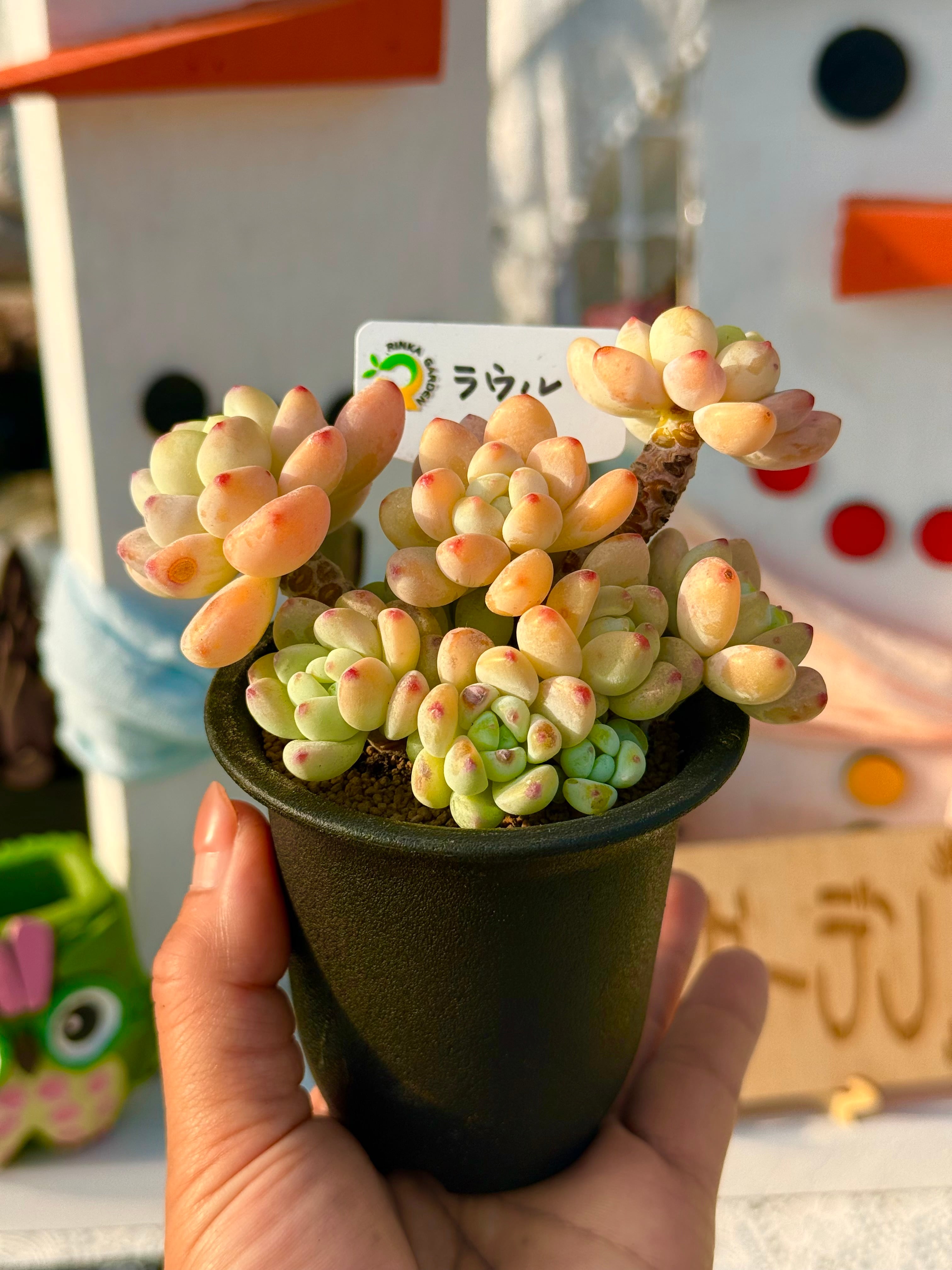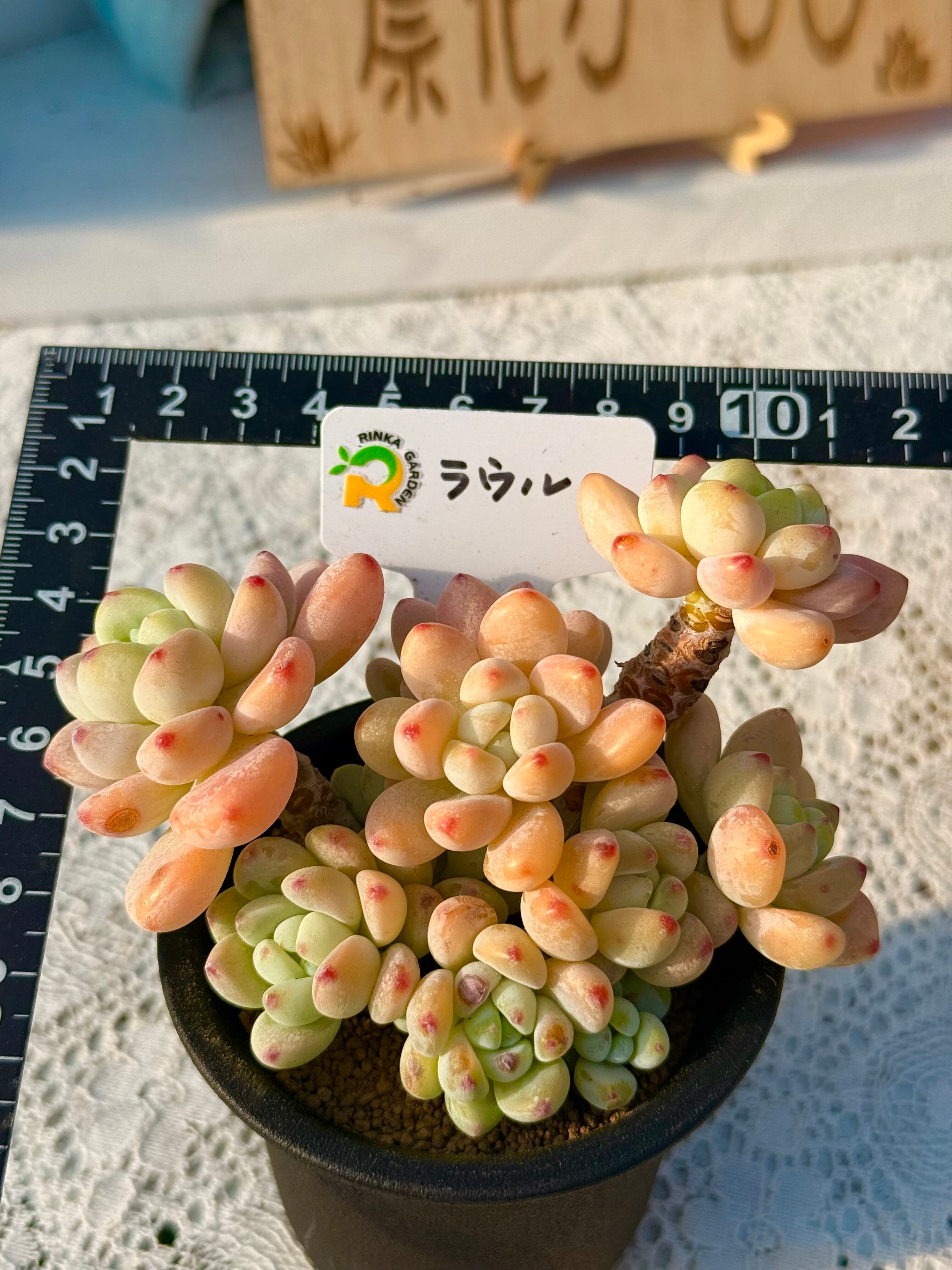 深みのあるロゼットに、夕焼けのような温かく繊細な色彩が魅力の「ラウル」です。オレンジ、ピンク、淡いグリーンがグラデーションのように溶け合い、光の加減でその表情を優しく変えます。