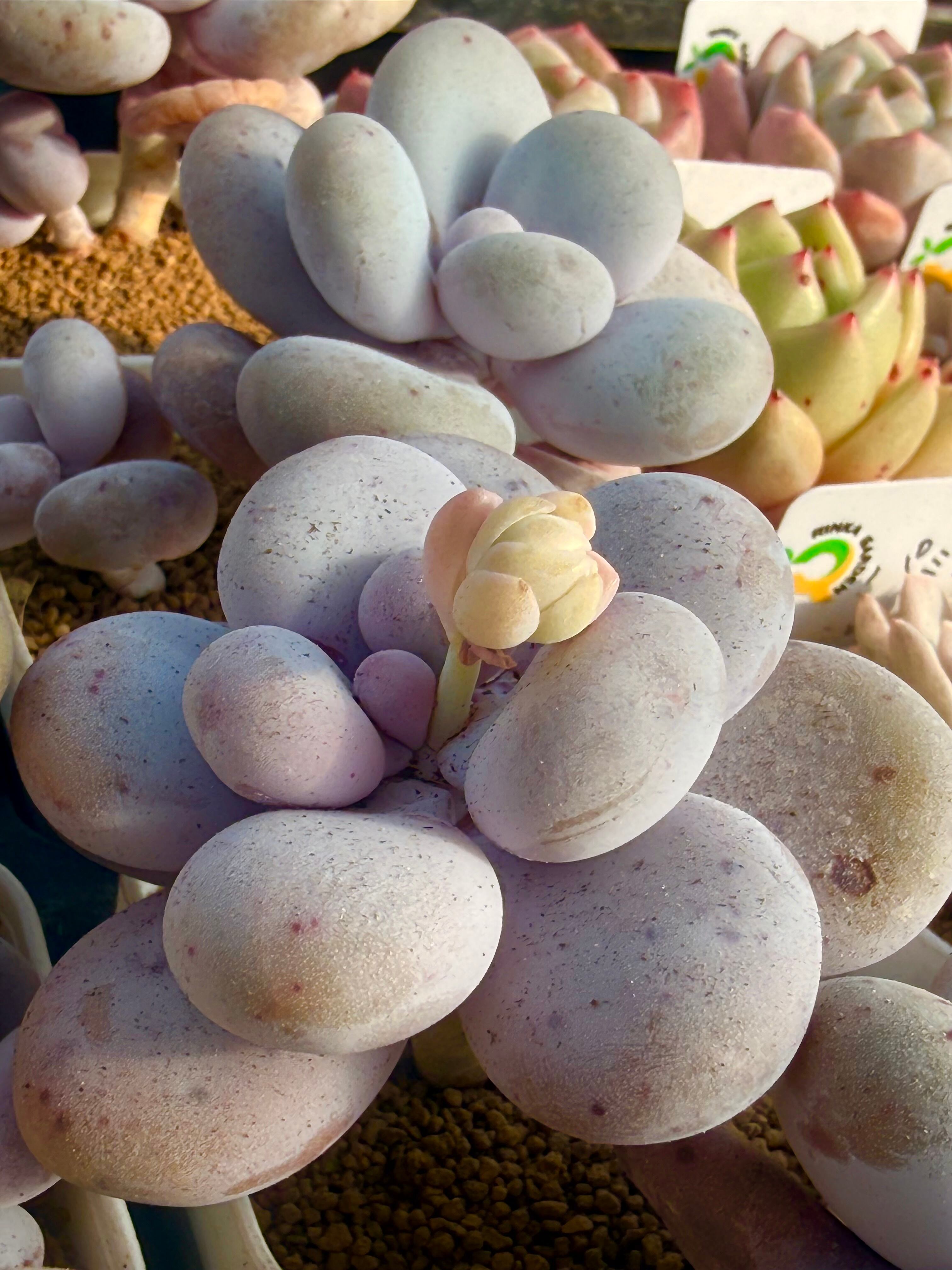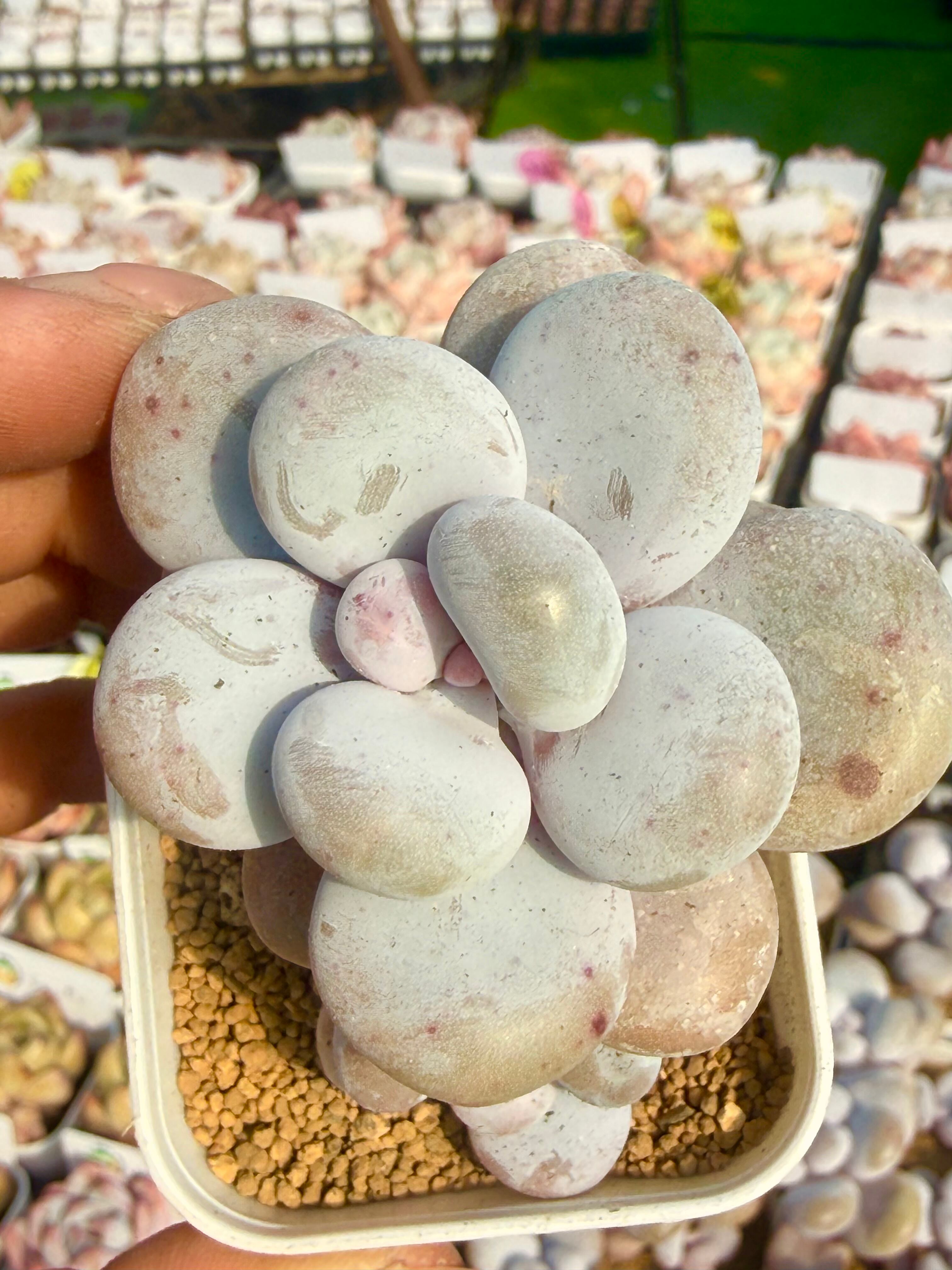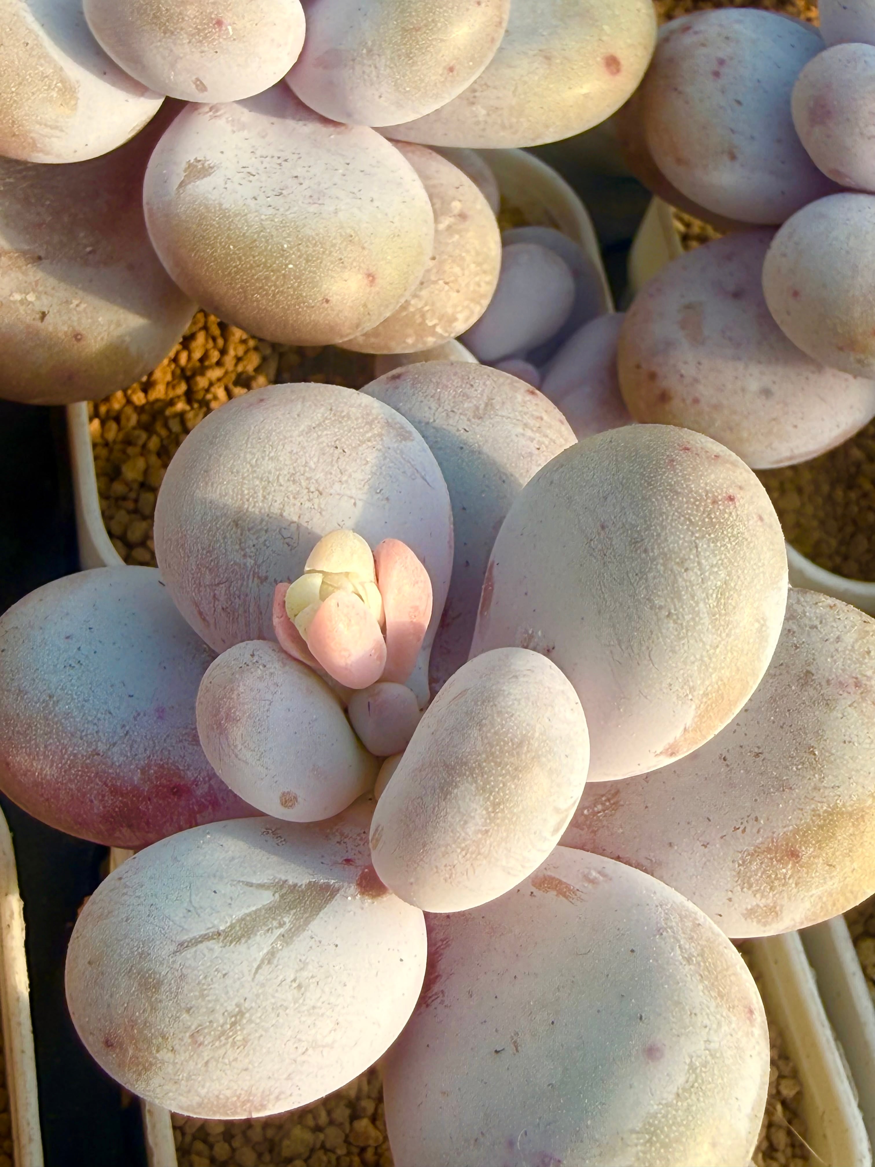 プリッと厚みのある葉は、淡いクリームイエローからほのかなピンクへとグラデーションし、どこか温かみを感じさせます。特に根系がしっかりと健康な状態の株をセレクト。5.5cmの角鉢に収まった、愛らしいサイズです。