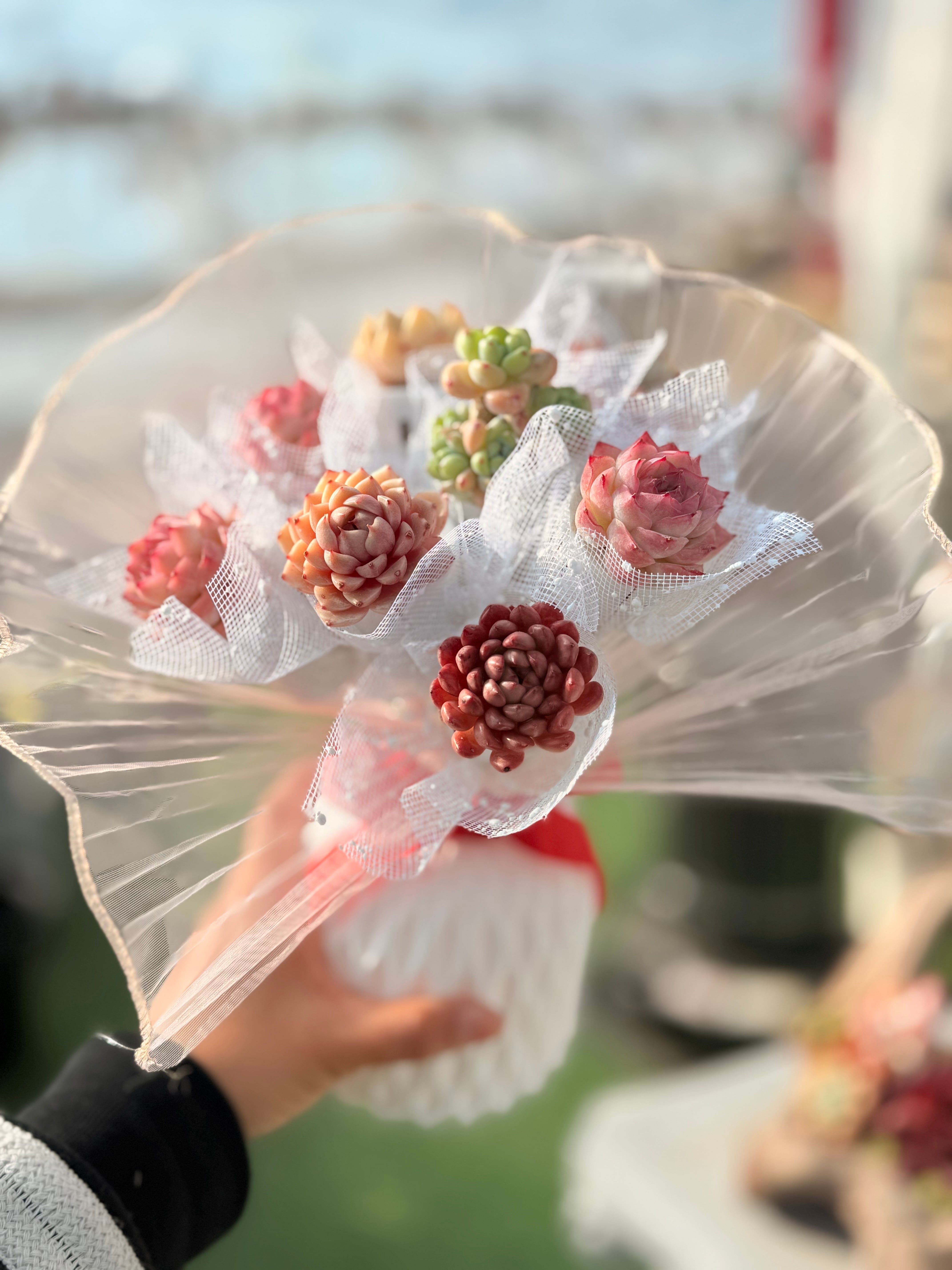 凛花ガーデン謹製の本格派「多肉の花束」。土を使わない清潔な多肉8種を、特別な技法で束ね、洗練された特製ラッピングでお届けします(花器は含まれません)。