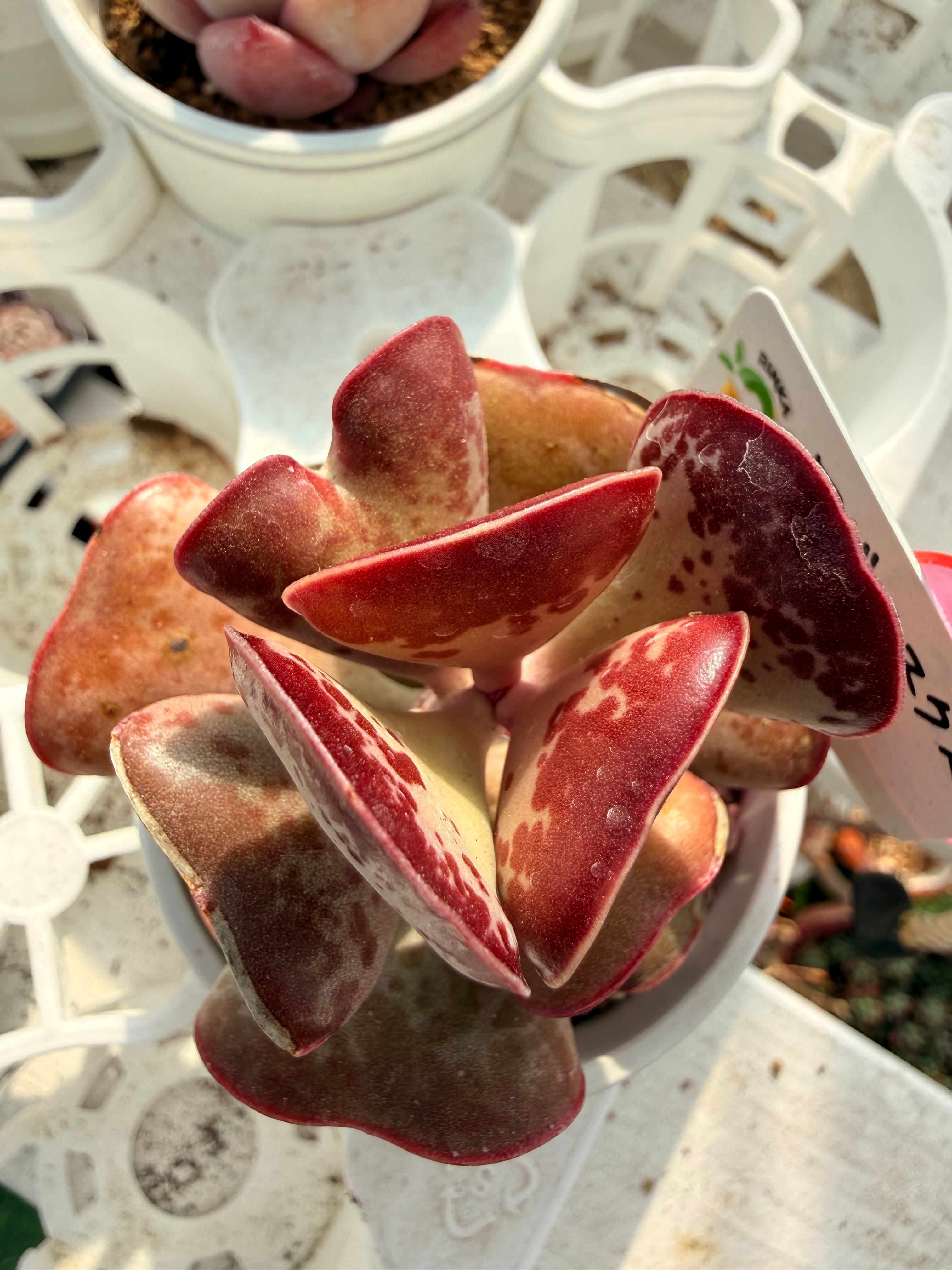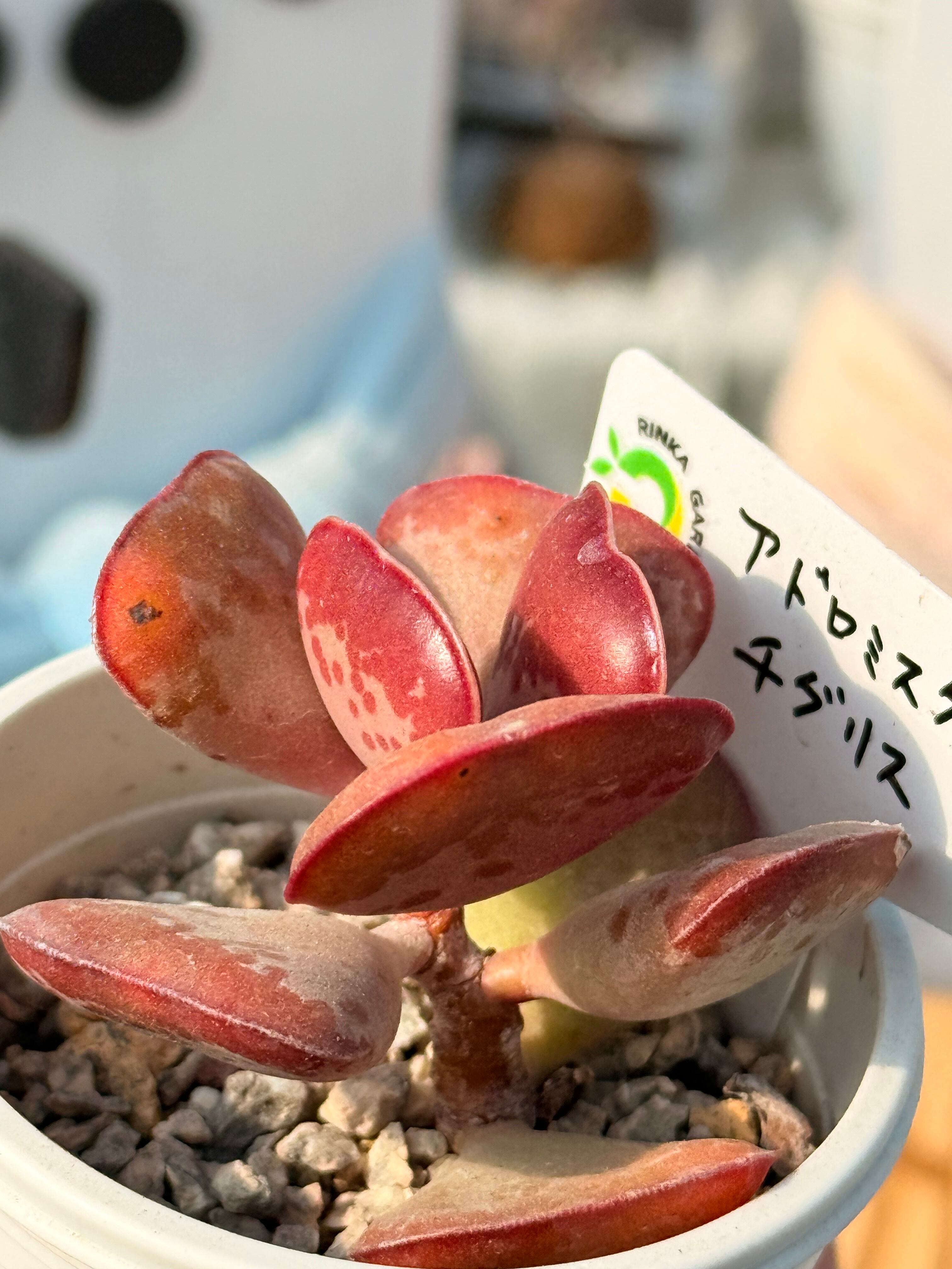 一つひとつの葉が愛らしいハート型をしており、それがぎゅっと密に集まって生長します。凛花ガーデンで約2年間、愛情を込めて育ててきた自慢の株で、非常に健康でしっかりと根張りの良い状態です。渋く落ち着いた色合いの葉に、時に現れる個性的な斑点が、マニアックな魅力を添えています。育てるほどにその愛らしい葉形と健やかな生長を実感できる、味わい深い一品です。