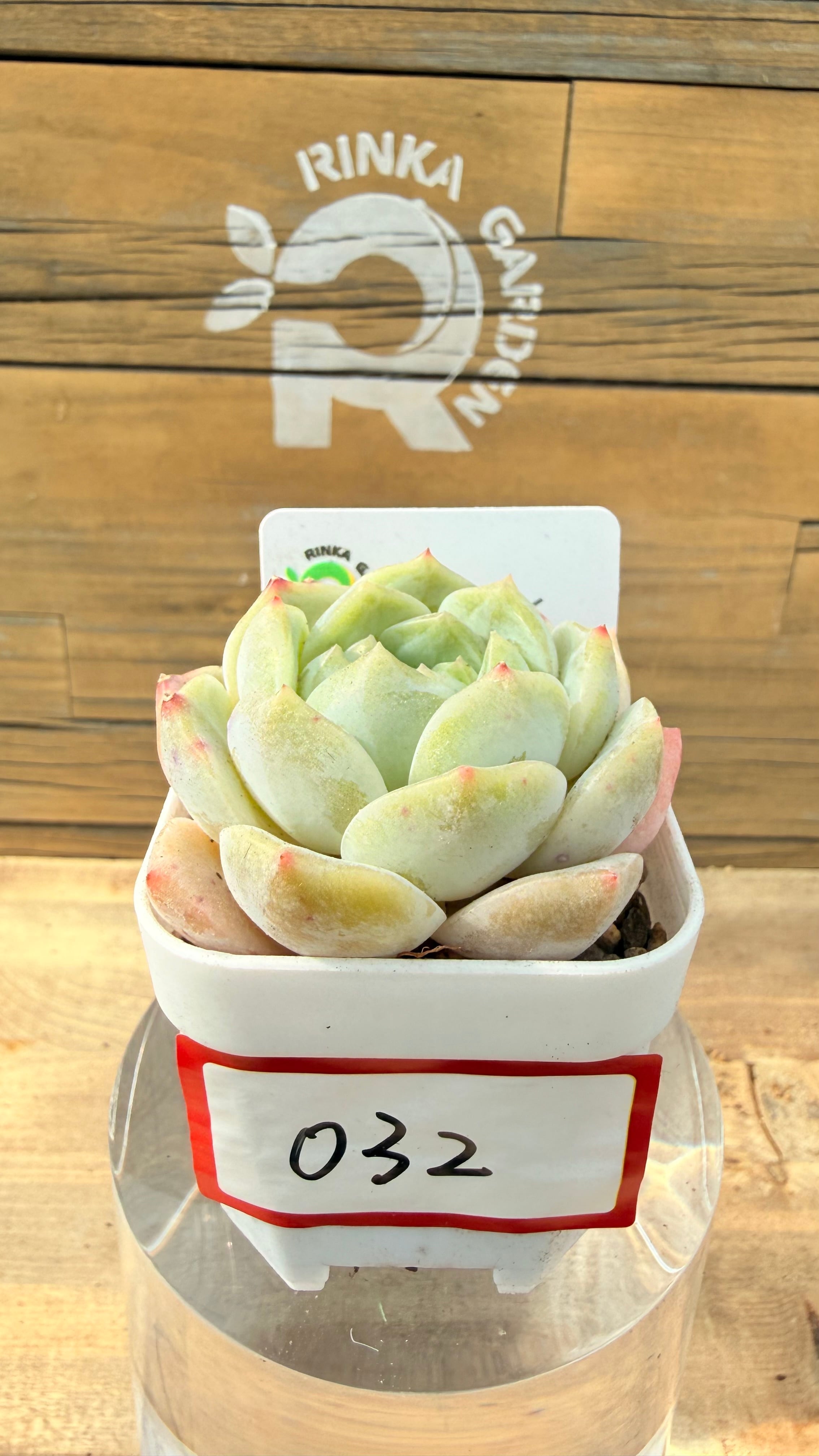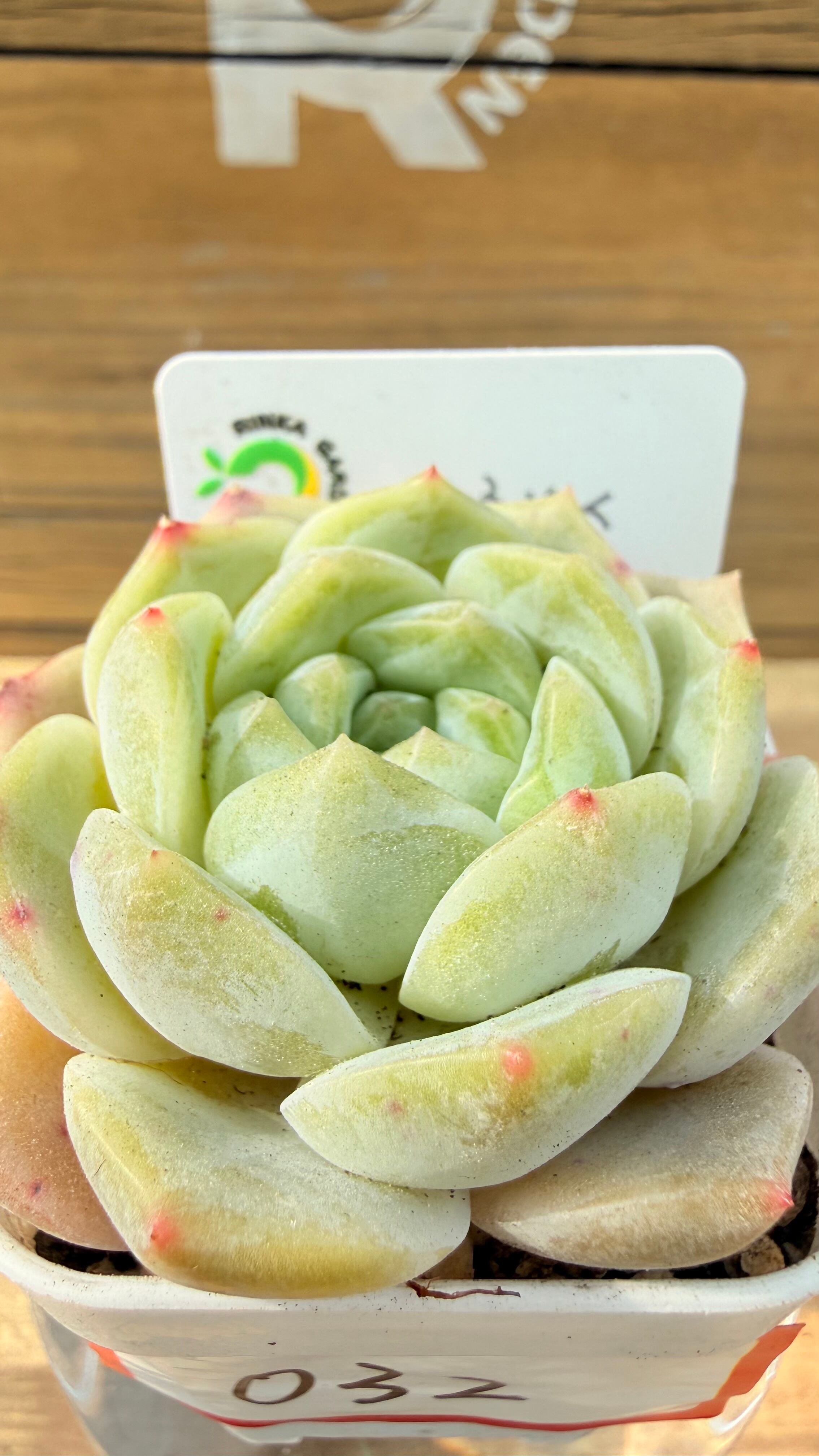 淡いグリーンからほんのりとピンクが差す葉色は、まるで春の陽だまりのような温かみがあります。しっかりと引き締まったロゼットフォルムは、見る角度によって優しく表情を変えます。