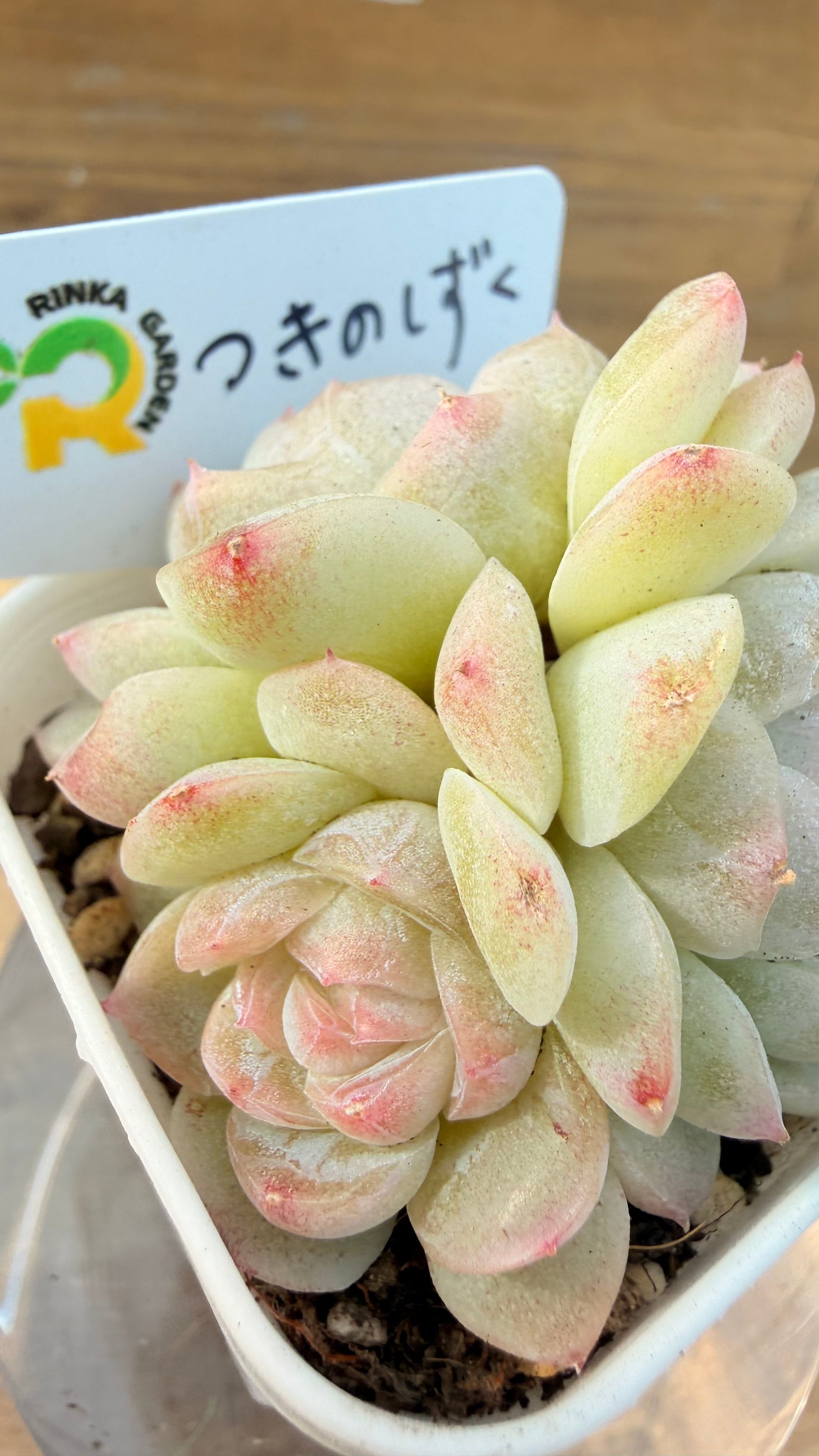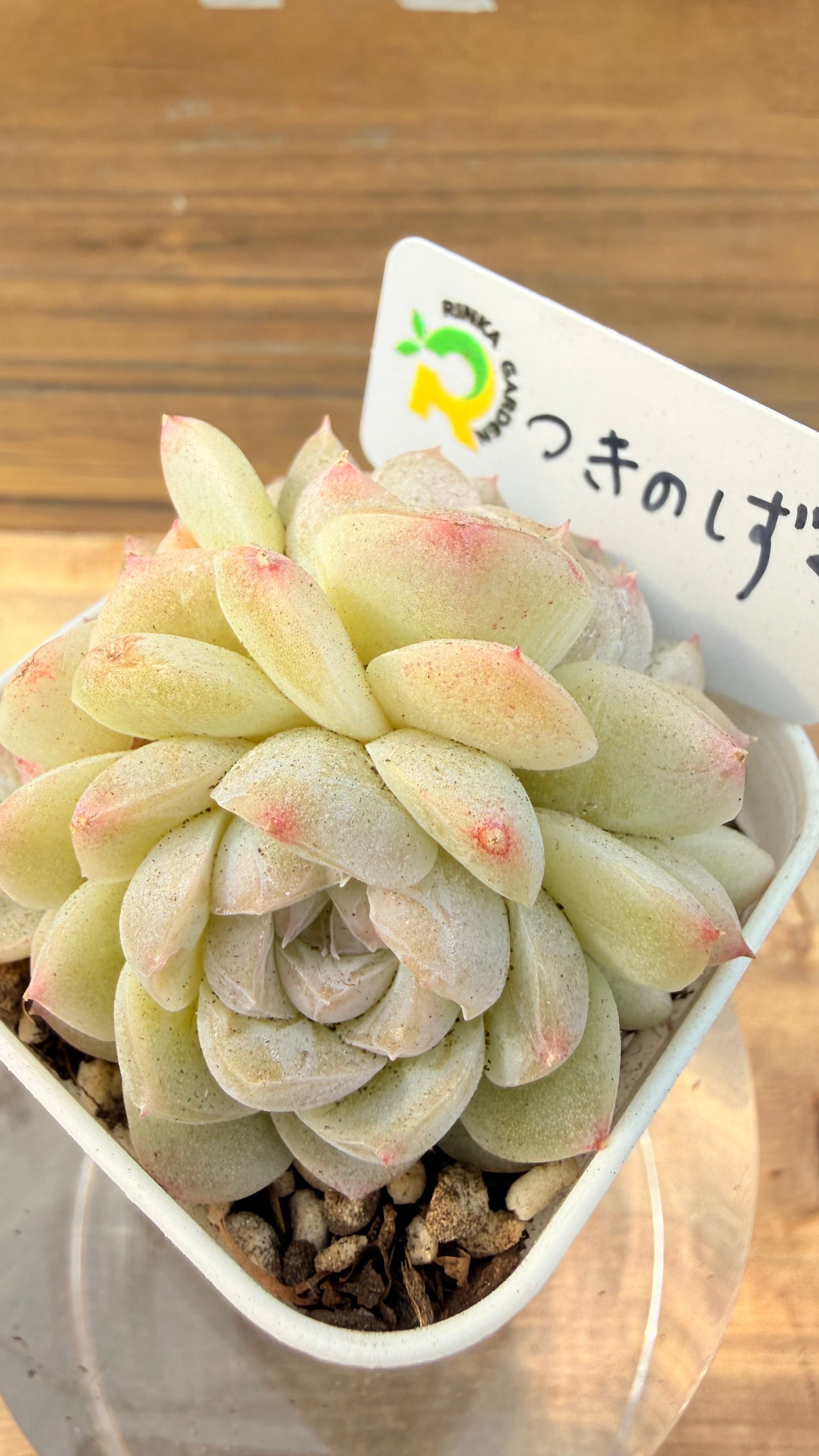 ロゼットは比較的コンパクトにまとまり、整った美しい姿を見せます。紅葉時には葉先がほんのりとピンク色に染まり、その優しい色合いが「月のしずく」という名前にふさわしい可憐さを引き立てます。