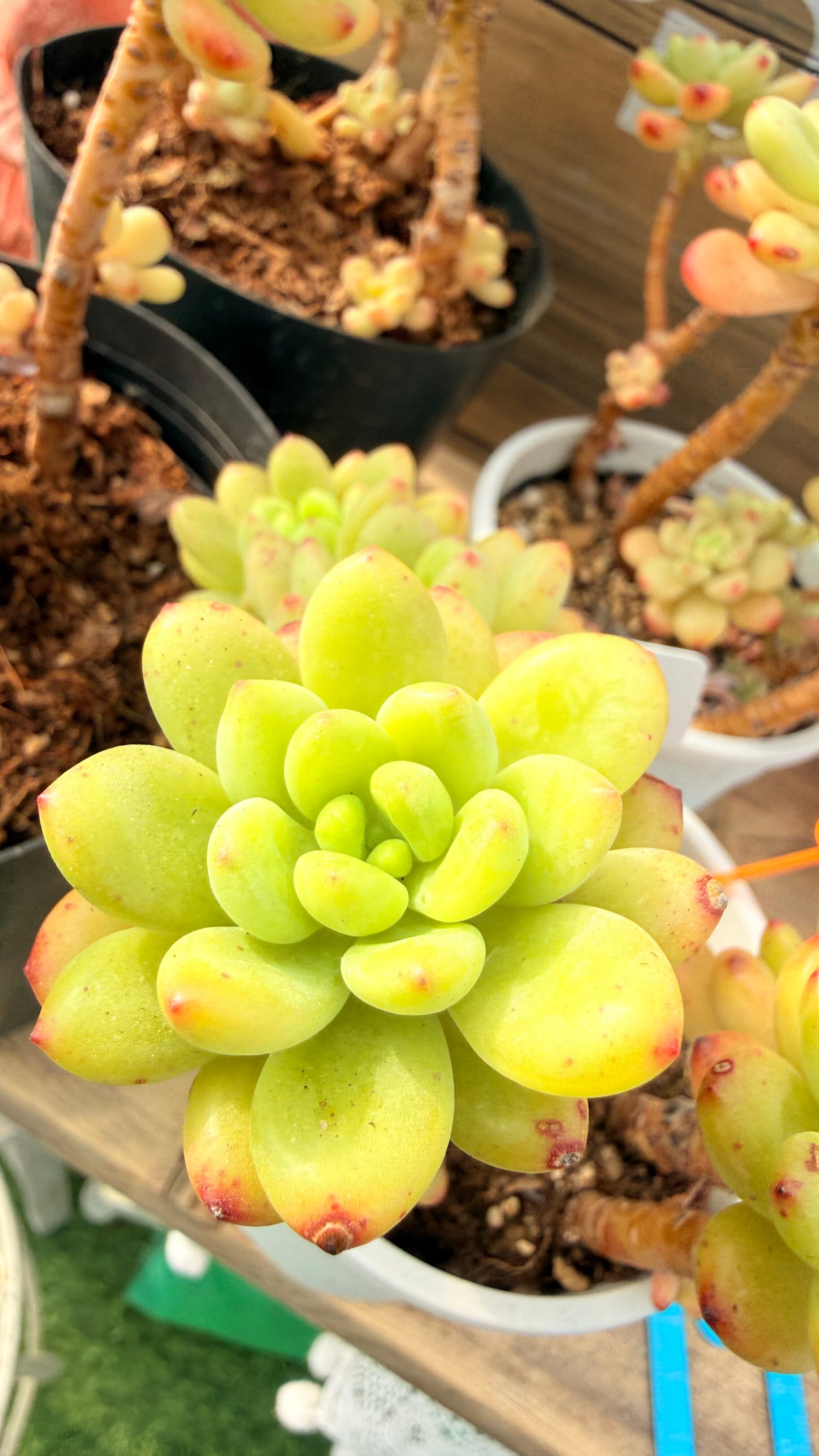 茎はしっかりと木質化し、樹齢を感じさせる風格が漂います。高さは10cm以上あり、その存在感は他の苗とは一線を画します。