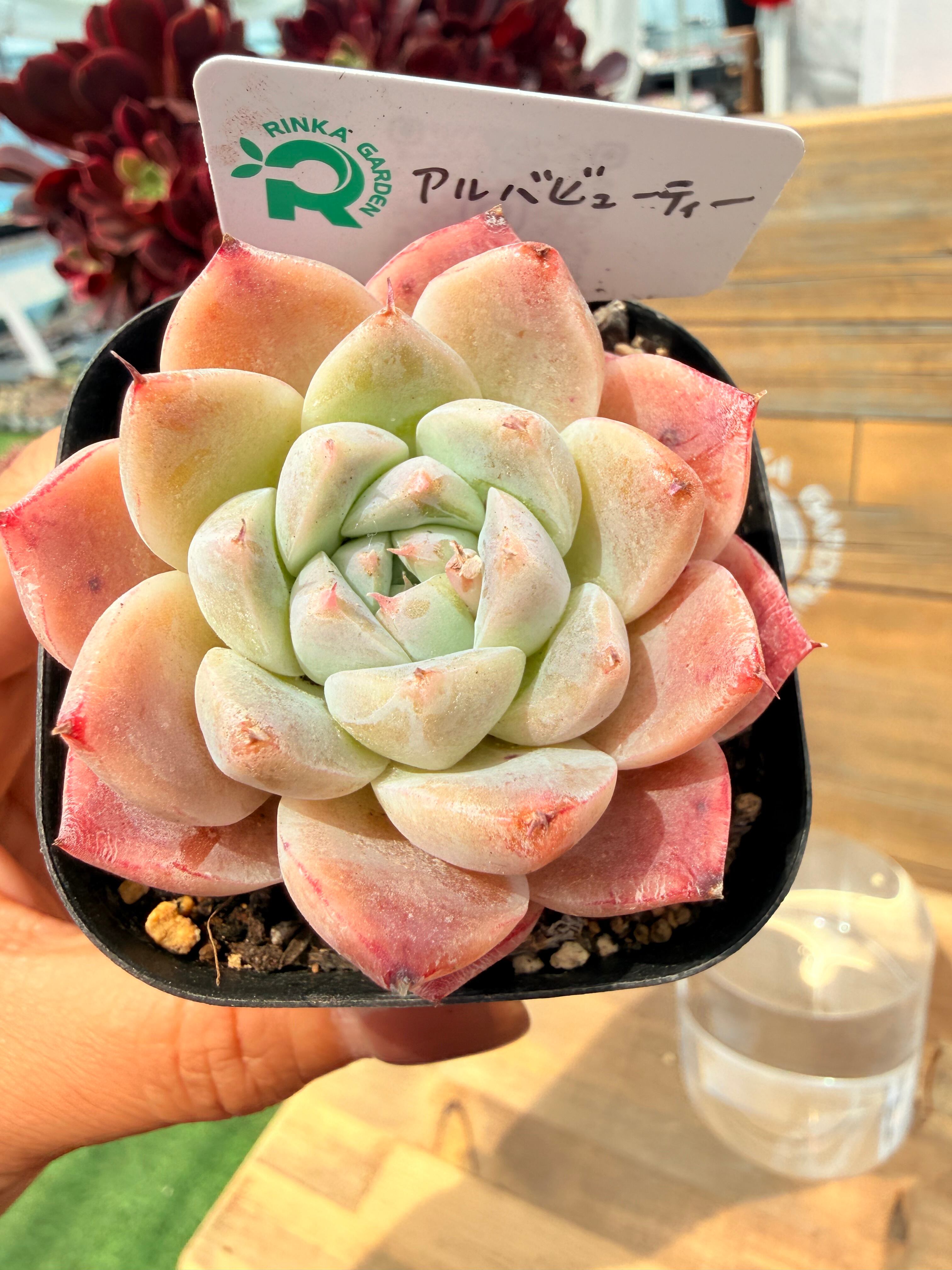 最大の魅力は、明るく透明感のある葉が重なるロゼットフォルム。光に透かすと、葉の縁からほんのりとピンクが差し、その上品な色合いが気品を漂わせます。
