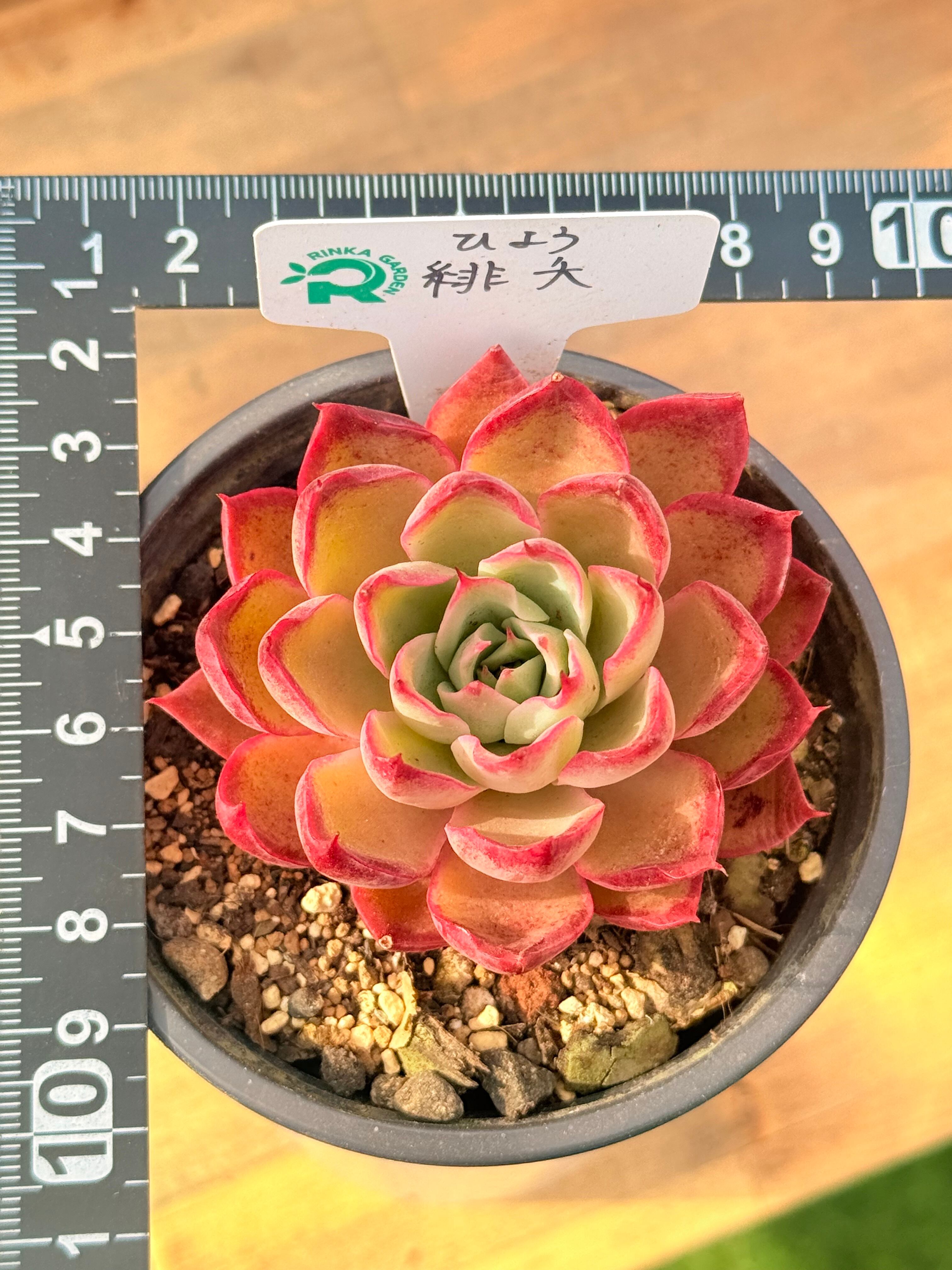 「ひよう(緋夭)」は、名前の通りほんのりと赤く染まる可憐なエケベリア。「緋(あか)い」と「夭(わか)い」という漢字が織りなす、どこか儚くも美しい雰囲気が魅力です。