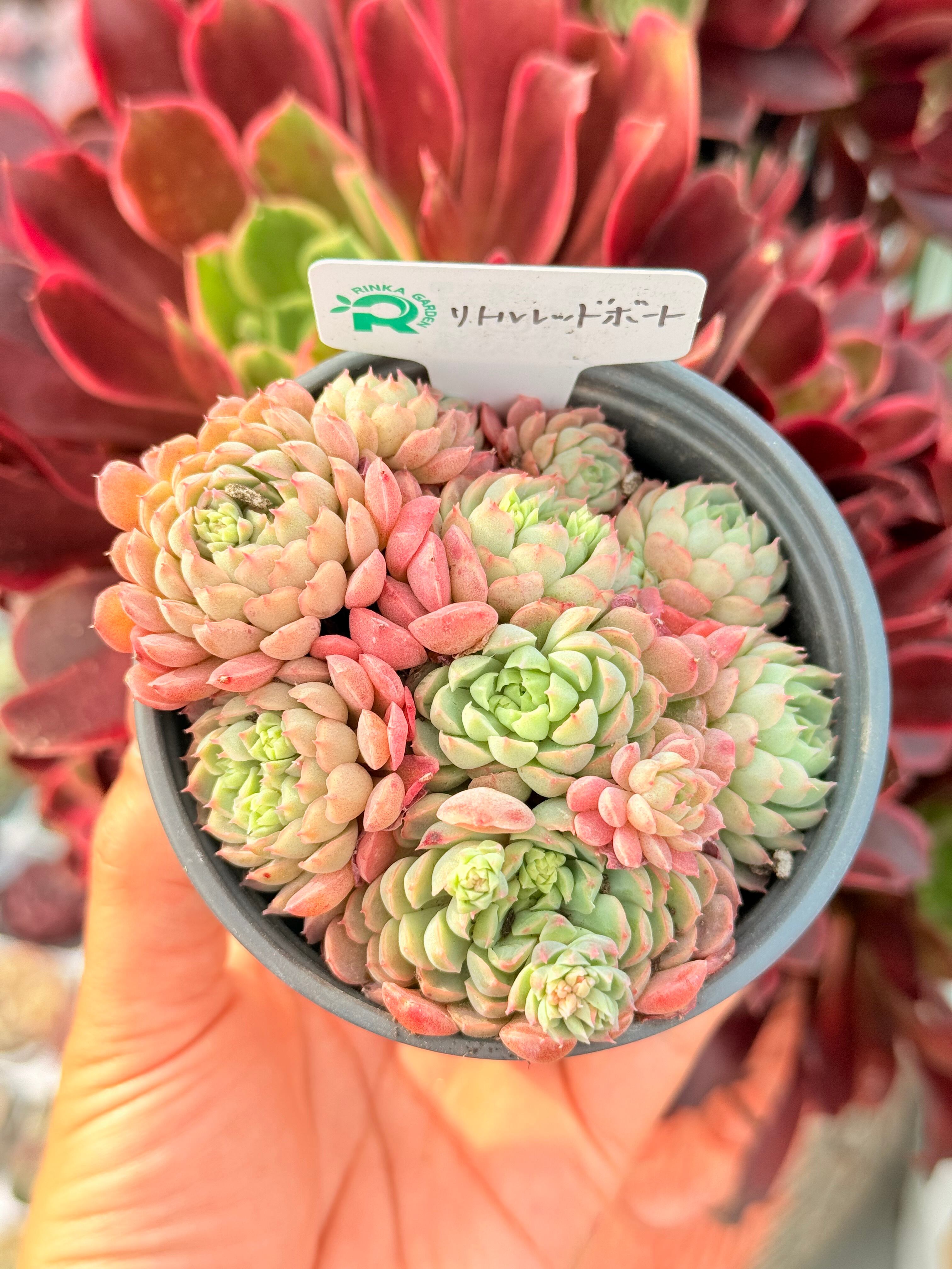 「リトルレッドボート」、その名前の由来は中国語の「小红包(シャオホンバオ)」。「小さな赤い袱紗(お祝い袋)」という意味です。その名の通り、ぷっくりと丸い葉が重なり合う様子は、まるで縁起の良い小さな赤い袱紗が幾重にも折り重なっているようです。