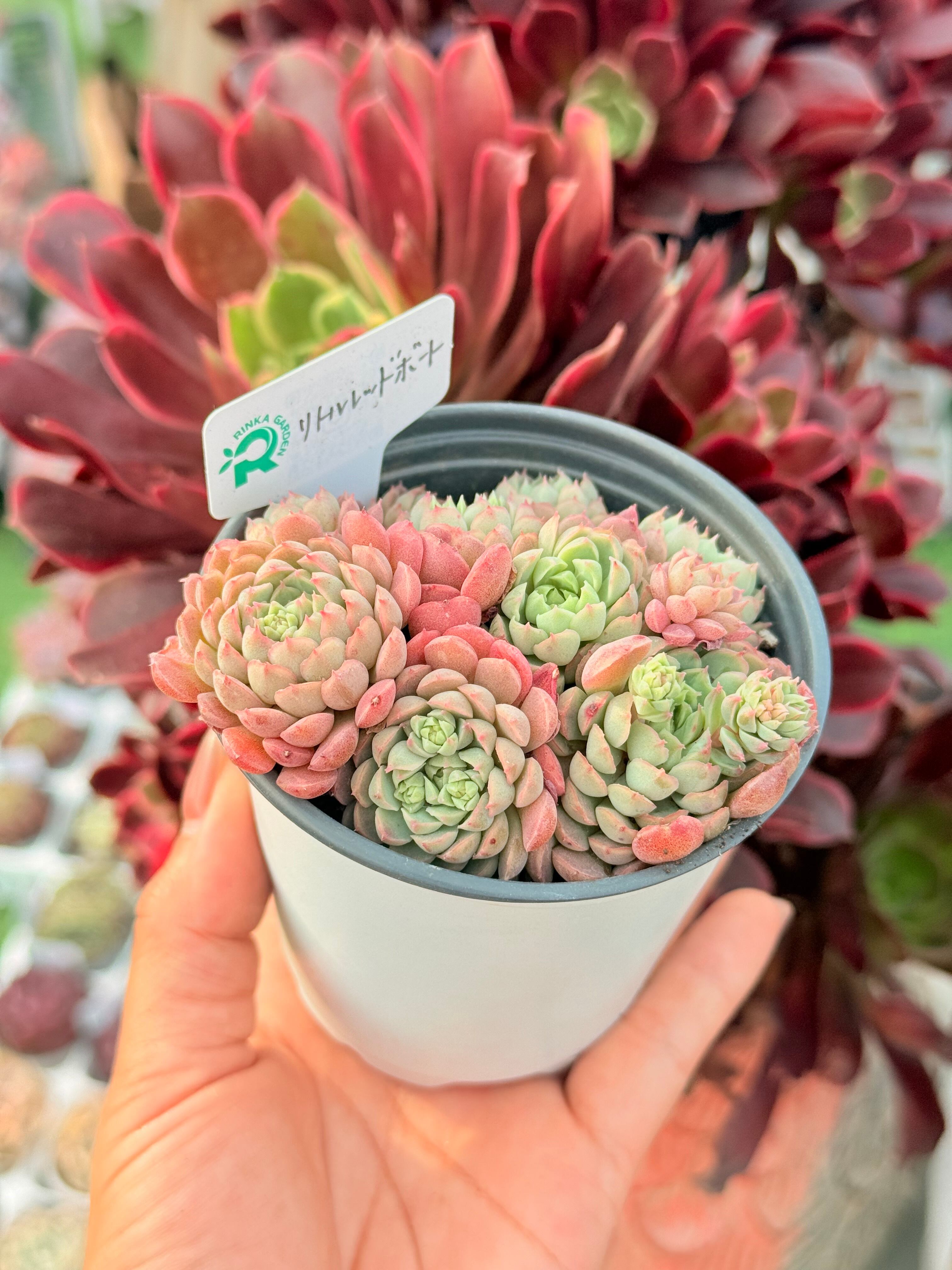 この品種の最大の魅力は、そのぷっくりとした丸い葉がぎゅっと密集して、まるで何かを包み込んでいるような愛らしいフォルム。葉の色は、爽やかなピスタチオグリーンをベースに、葉の縁や先端にかけて鮮やかな赤色が差します。