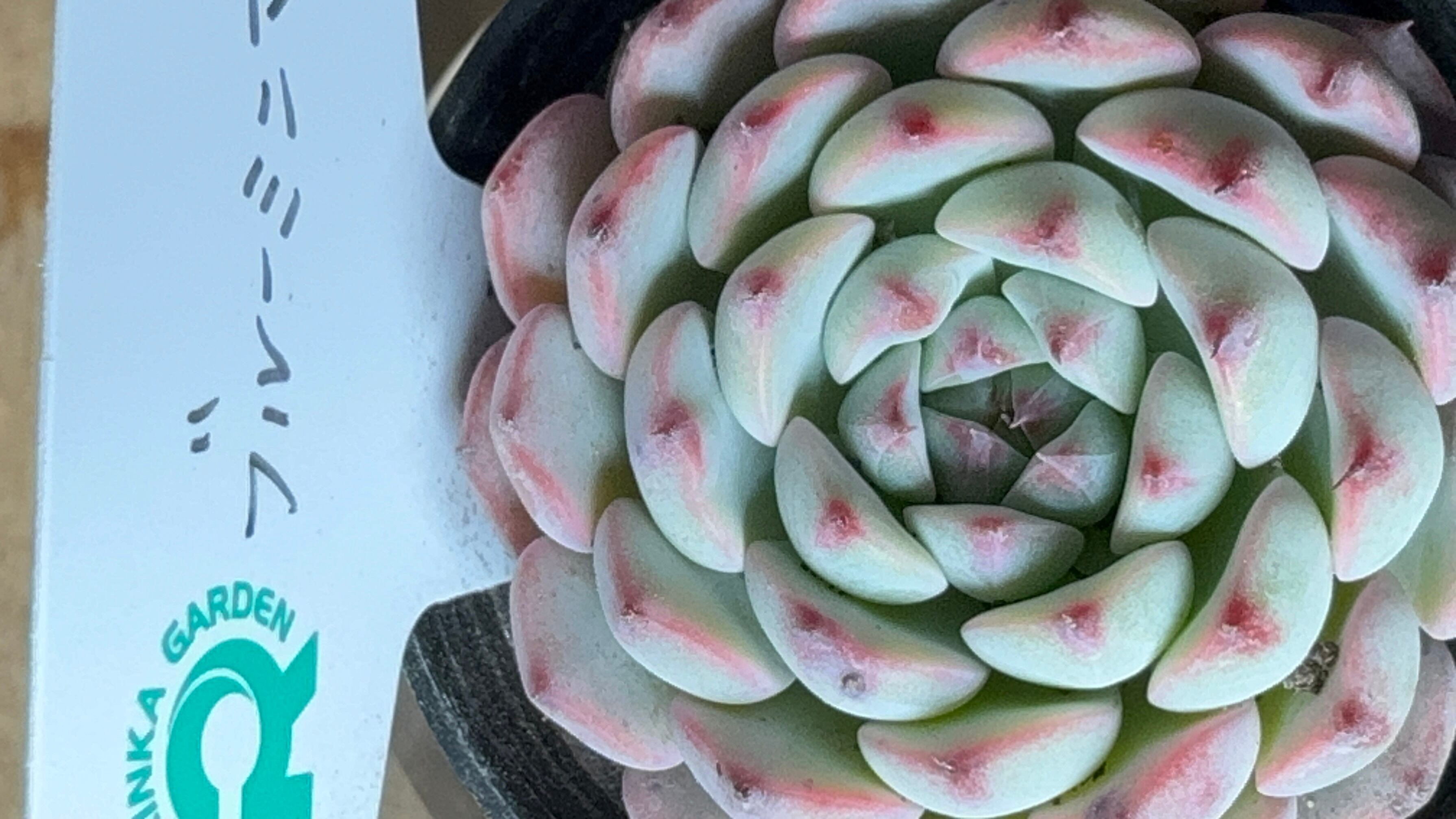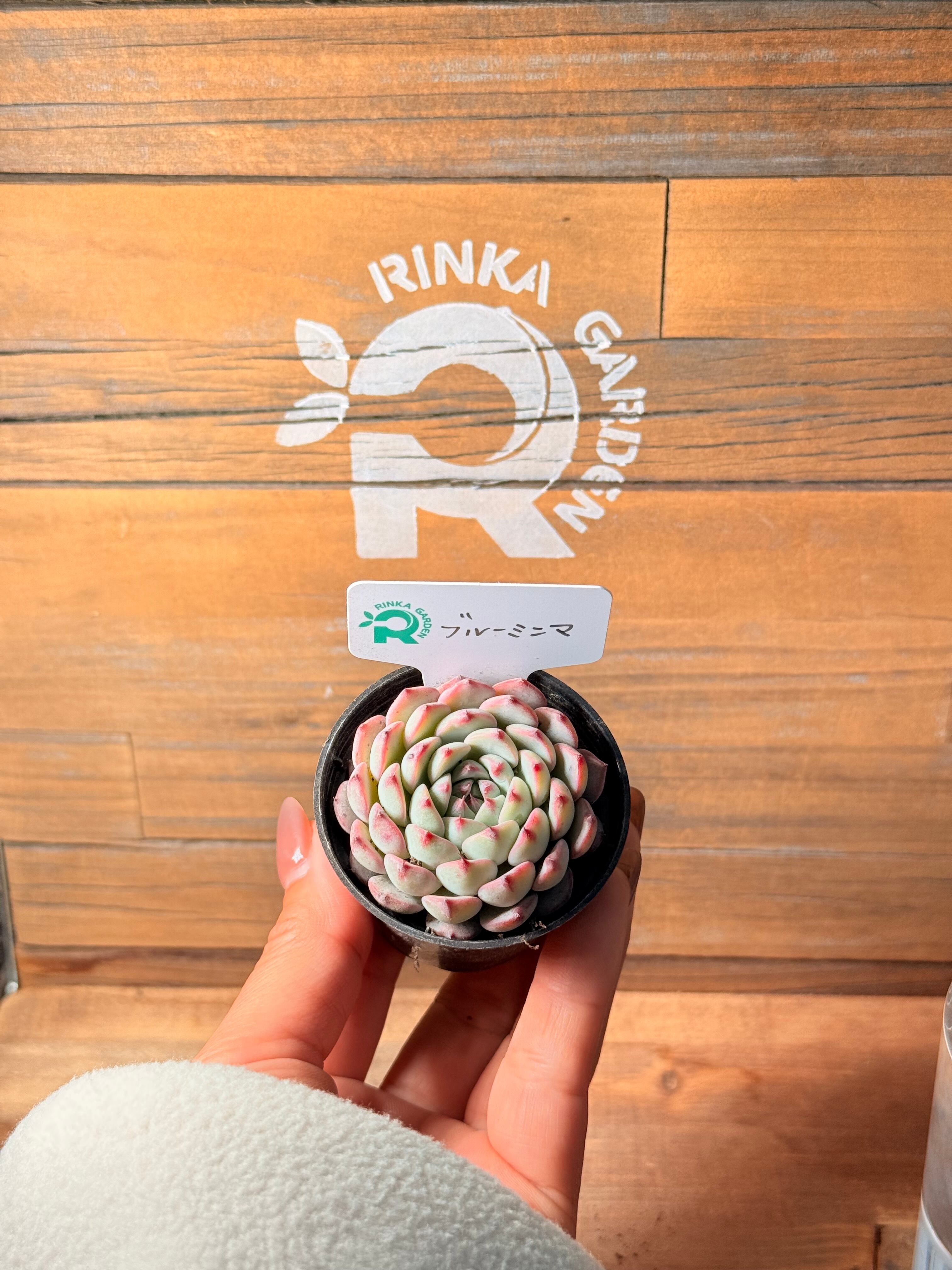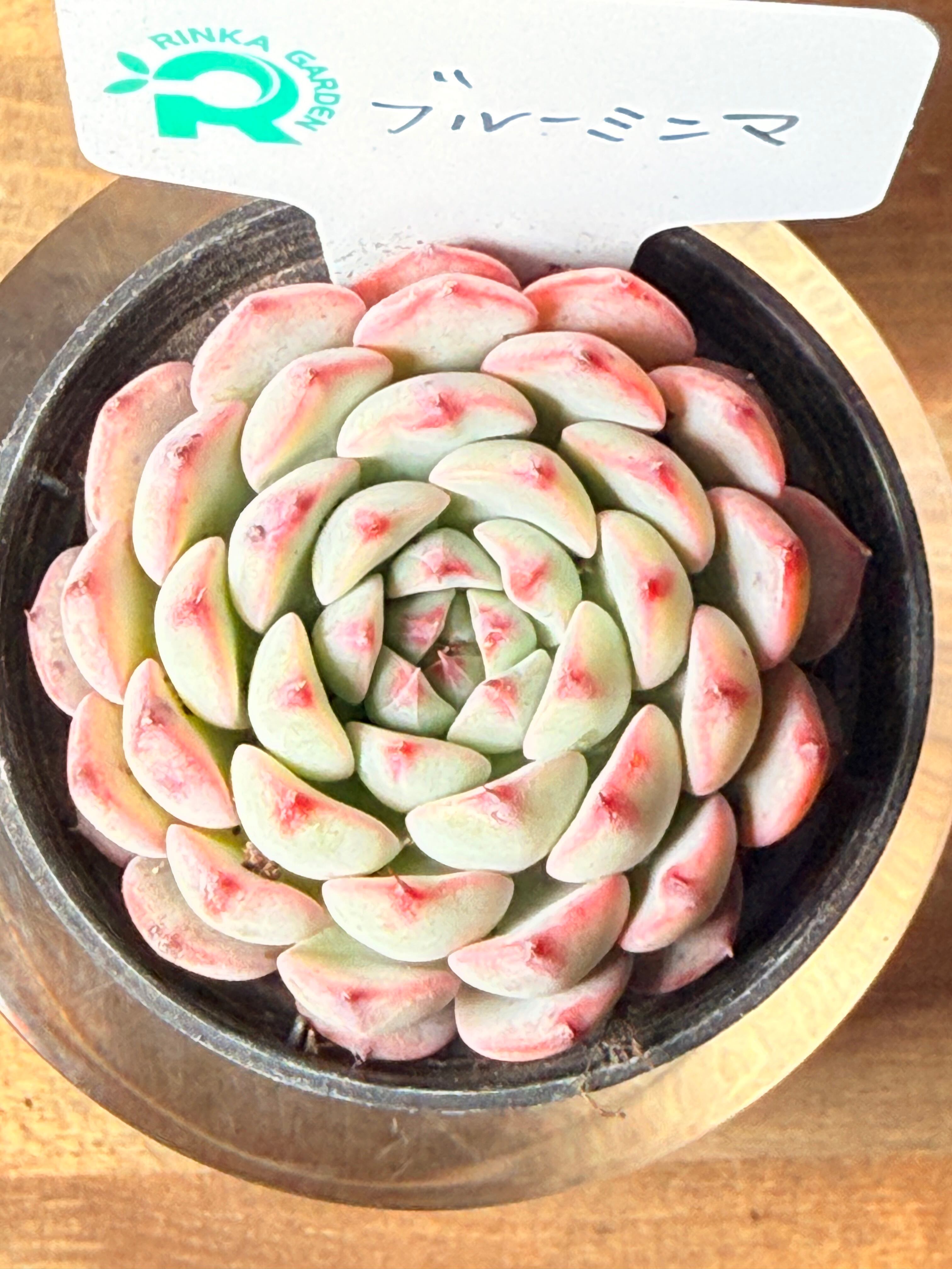 ブルーミニマは、その名の通り水彩画のような淡いブルーが魅力的なエケベリアです。コンパクトにまとまったロゼットに、白やピンクの錦がふわりと乗る姿は、まるで空の欠片のような清涼感があります。