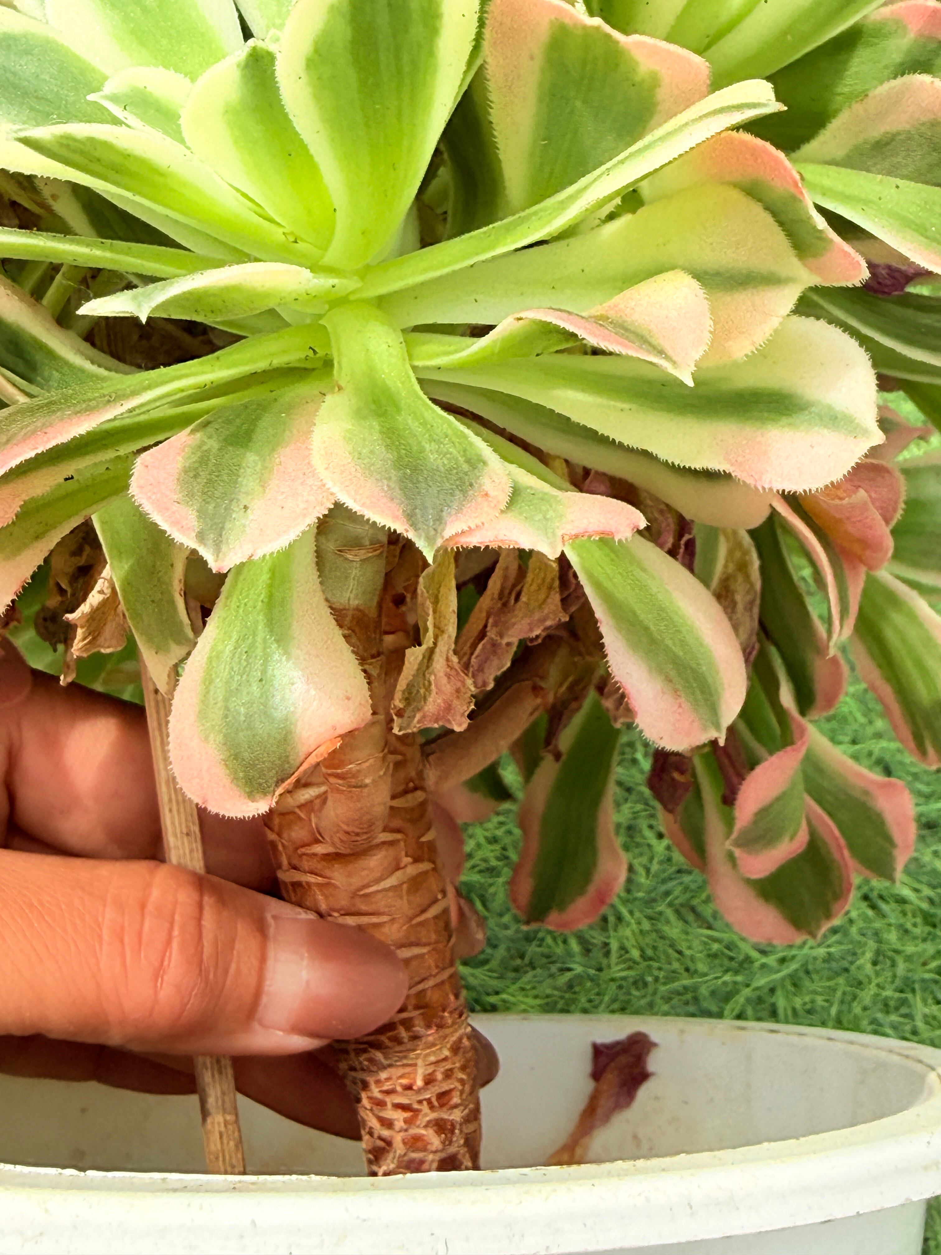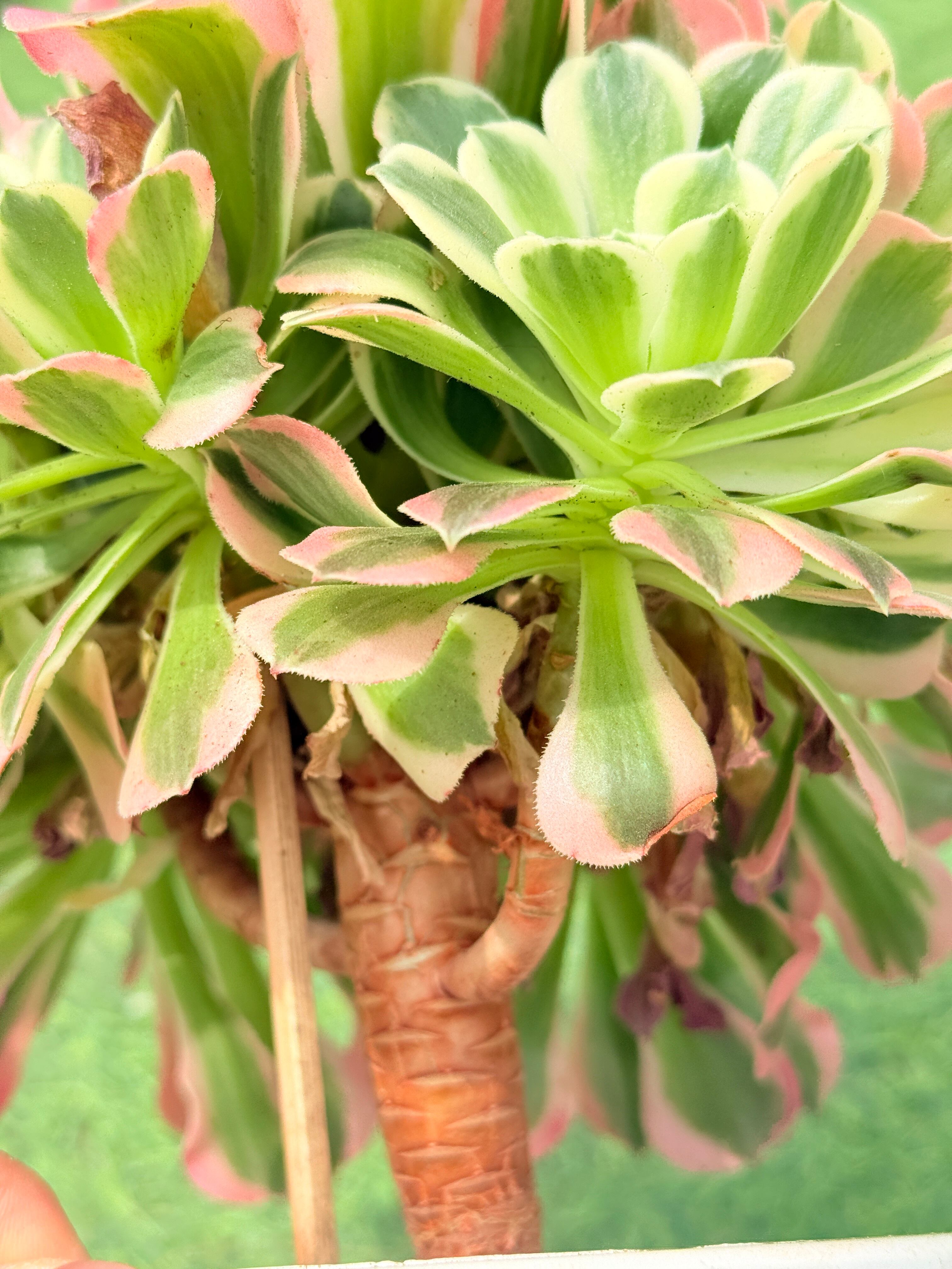 アエオニウムはその形状から「黒法師」などと呼ばれることもありますが、白鳳錦はそこに錦の華やかさが加わった特別な存在。幹が立ち上がり、年月とともに味わいのある樹形へと成長していく姿は、まるで盆栽のような風情です。特別な手入れをしなくても自然と子株をふやしながら育つ性質で、気づけば“白鳳錦の小さな森”が完成しているかもしれません。